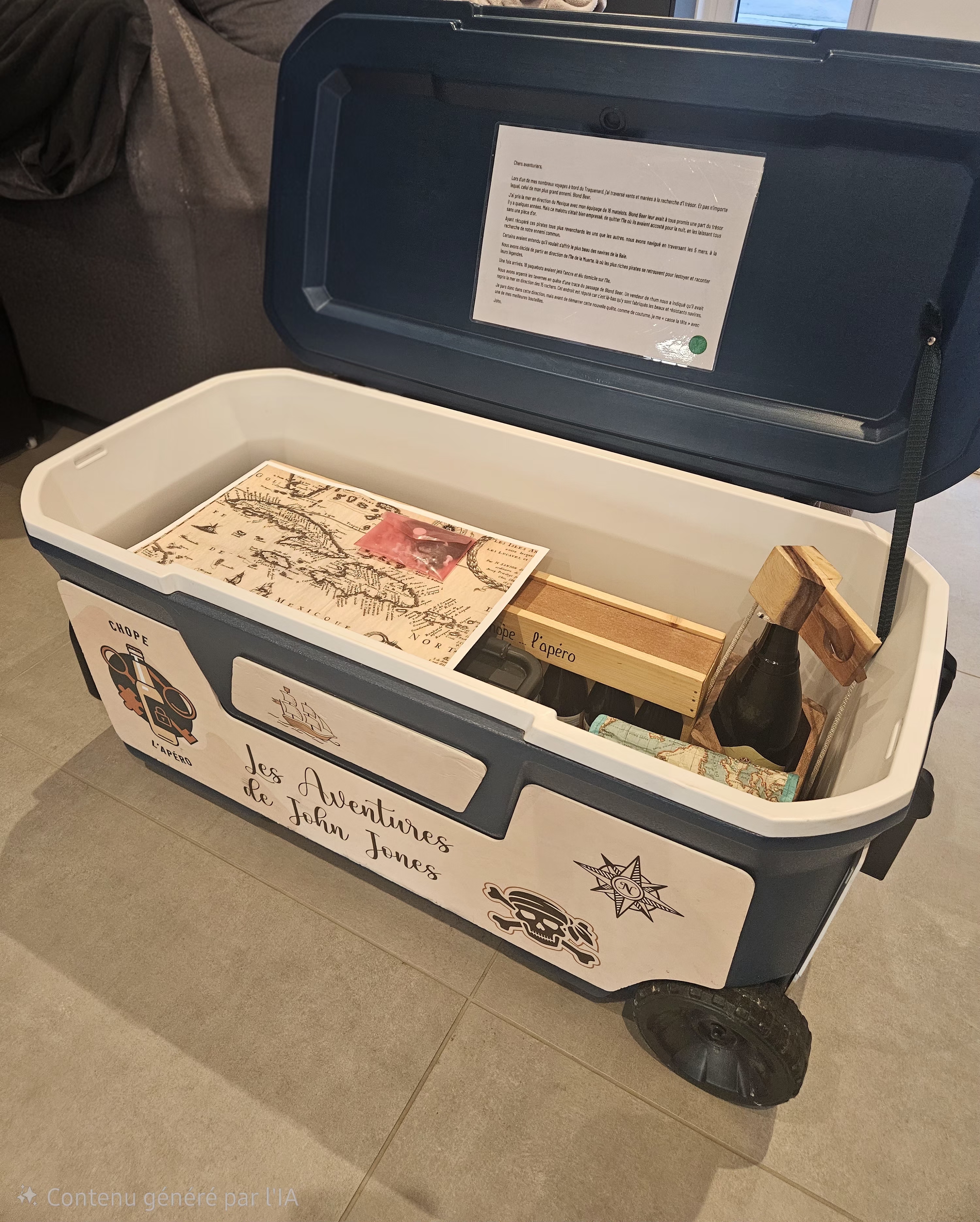 You receive a chained fridge box and must progress step by step, rack your brains, and open the different elements one after another (codes, rebuses, brainteasers, sensory and olfactory challenges, puzzles, …).